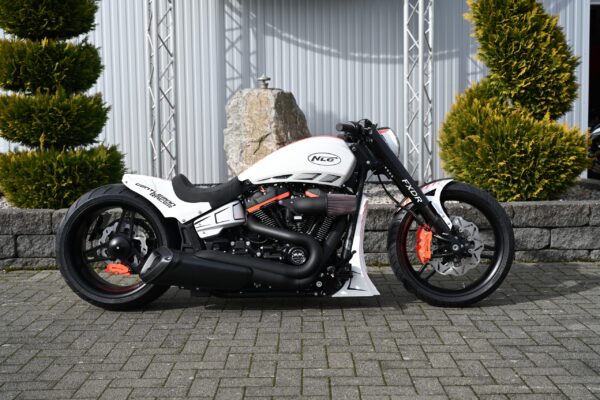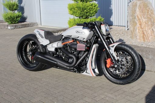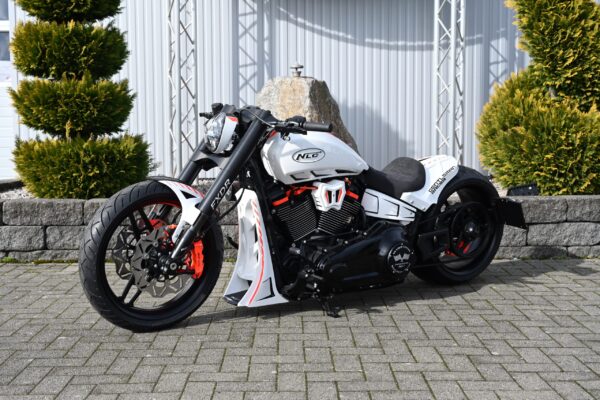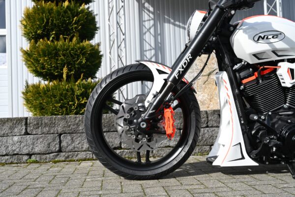 Unsere GP-1 NLC Gabel für die Harley Davidson Modelle ist ein Garant für einen perfekten Showauftritt. Sie muss mit Radial Bremszangen ausgestattet werden und besticht durch ein grandioses Design und einer Top Verarbeitung. Die 360 mm breite Gabel mit ihren massiven Coverrohren lässt auch eine breitere Bereifung vorne zu. Die Gabelbrücken sind eine Augenweite im NLC Style!!